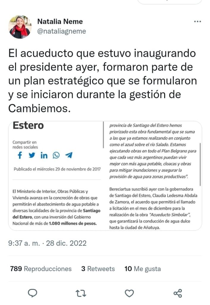 La principal referente de la UCR por Juntos por el Cambio, Natalia Neme tubo palabras para el gobierno tras dejar inaugurado el Acueducto Simbolar Añatuya, obra de vital importancia para los santiagueños que dio inicio en el 2017 bajo el gobierno de Cambiemos.