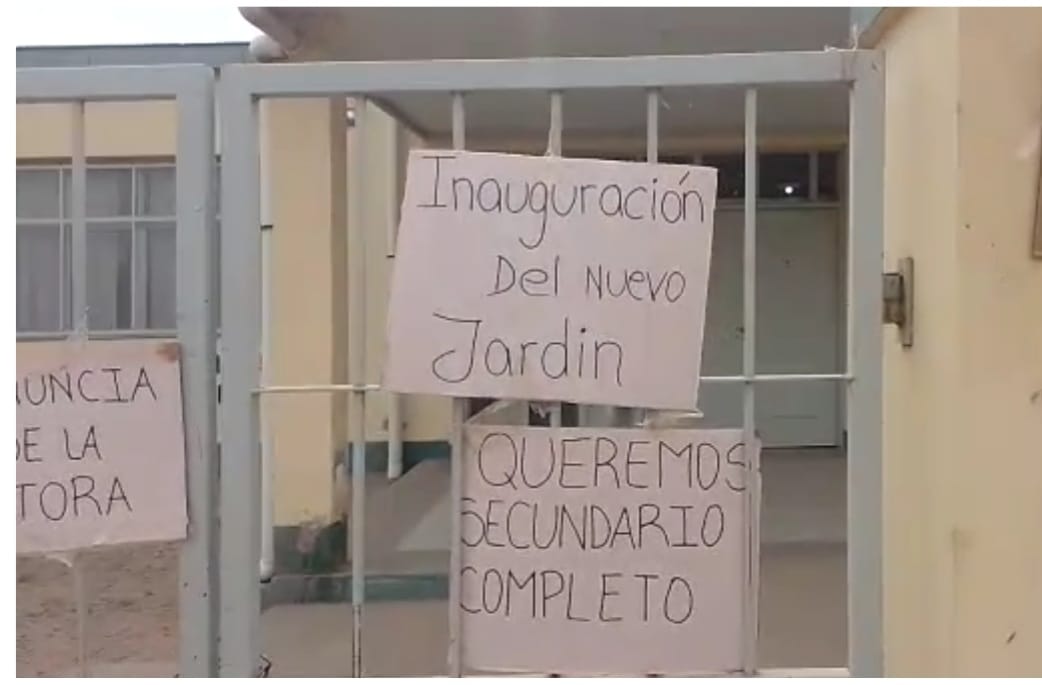 Padres de alumnos damnificados, manifestaron que los chicos de la secundaria de tercero, cuarto y quinto año no tienen clases hace varios meses y los alumnos de la salita de 4 del jardín de infantes anexo a la escuela no tienen clases desde el mes de abril